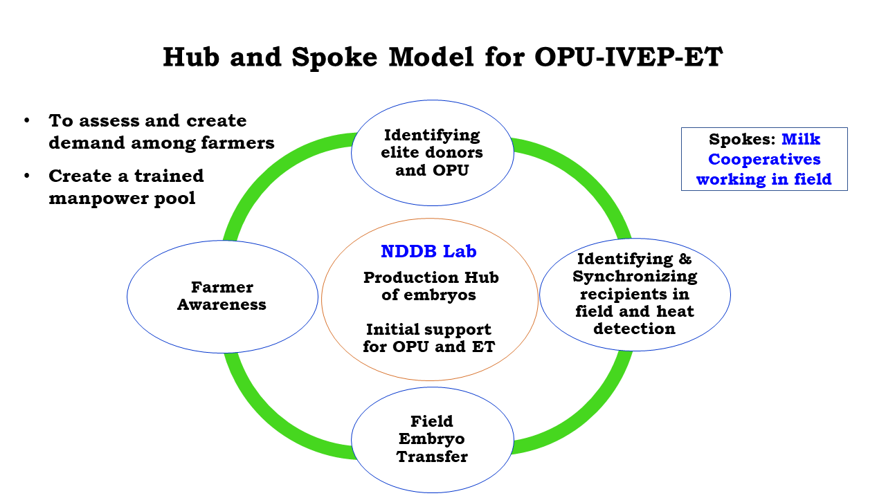 NDDB is pursuing the “Hub-and-Spoke” model for propagating the OPU-IVEP-ET Technology. In this, the NDDB’s OPU-IVEP facility acts as “Hub” and the Milk Unions (MUs) act as “Spoke”. Hub is responsible for production of embryos and Spokes are responsible for selection of donors and selection and synchronization of recipients for ET at the farmers’ doorsteps. In the initial phase, NDDB provides intensive training, and on-the-job hand holding. Later, trained veterinarians of MUs perform OPU and ET independently. The model reduced the cost of pregnancy establishment through IVF embryos, created a pool of trained manpower, along with saving initial laboratory establishment cost at MU level.